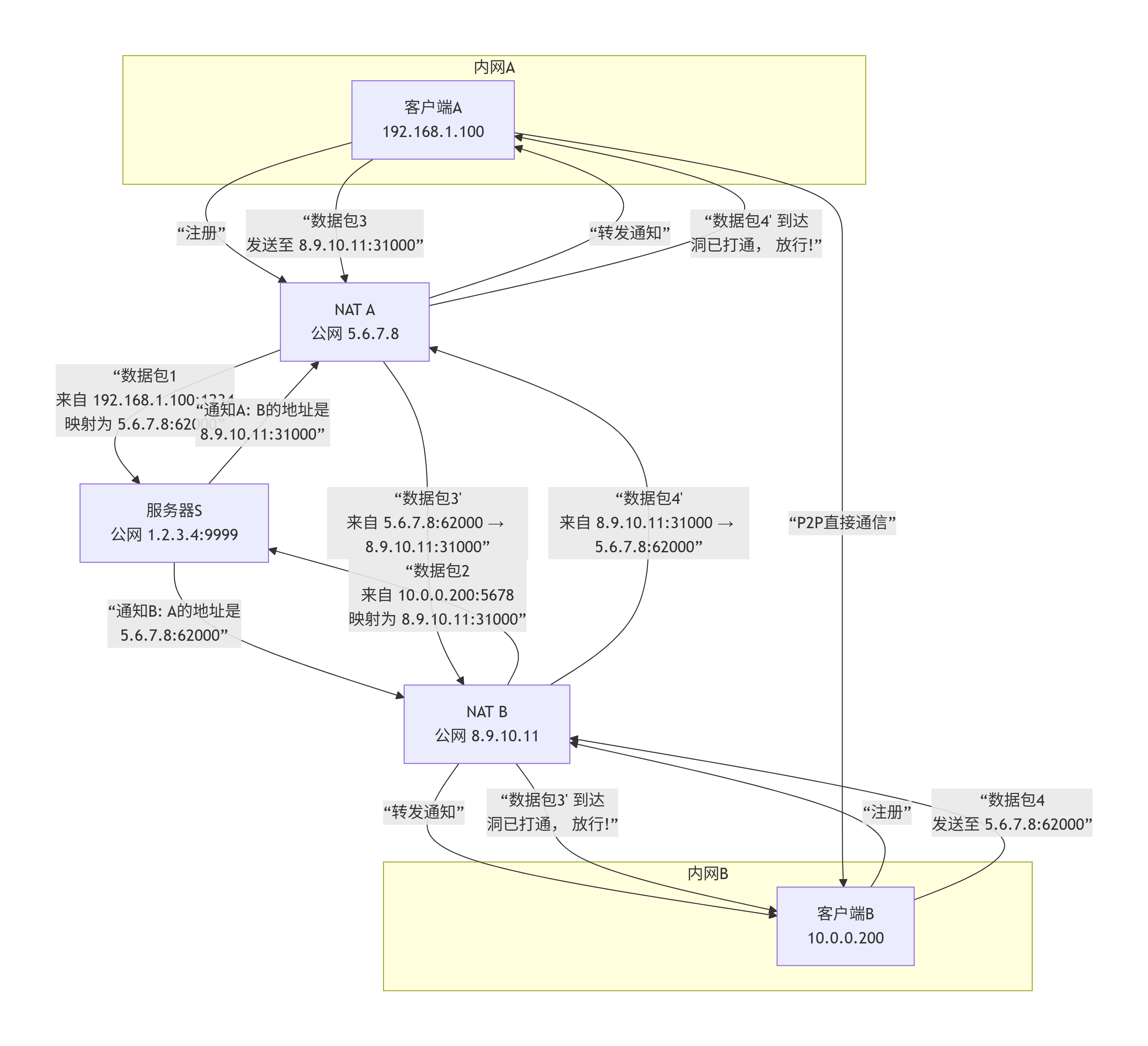 :利用拥有公网IP的服务器作为“介绍人”,引导两个内网客户端相互发送数据包,在各自的NAT设备上“凿”出临时孔洞,从而建立直接连接,无需服务器中转数据。