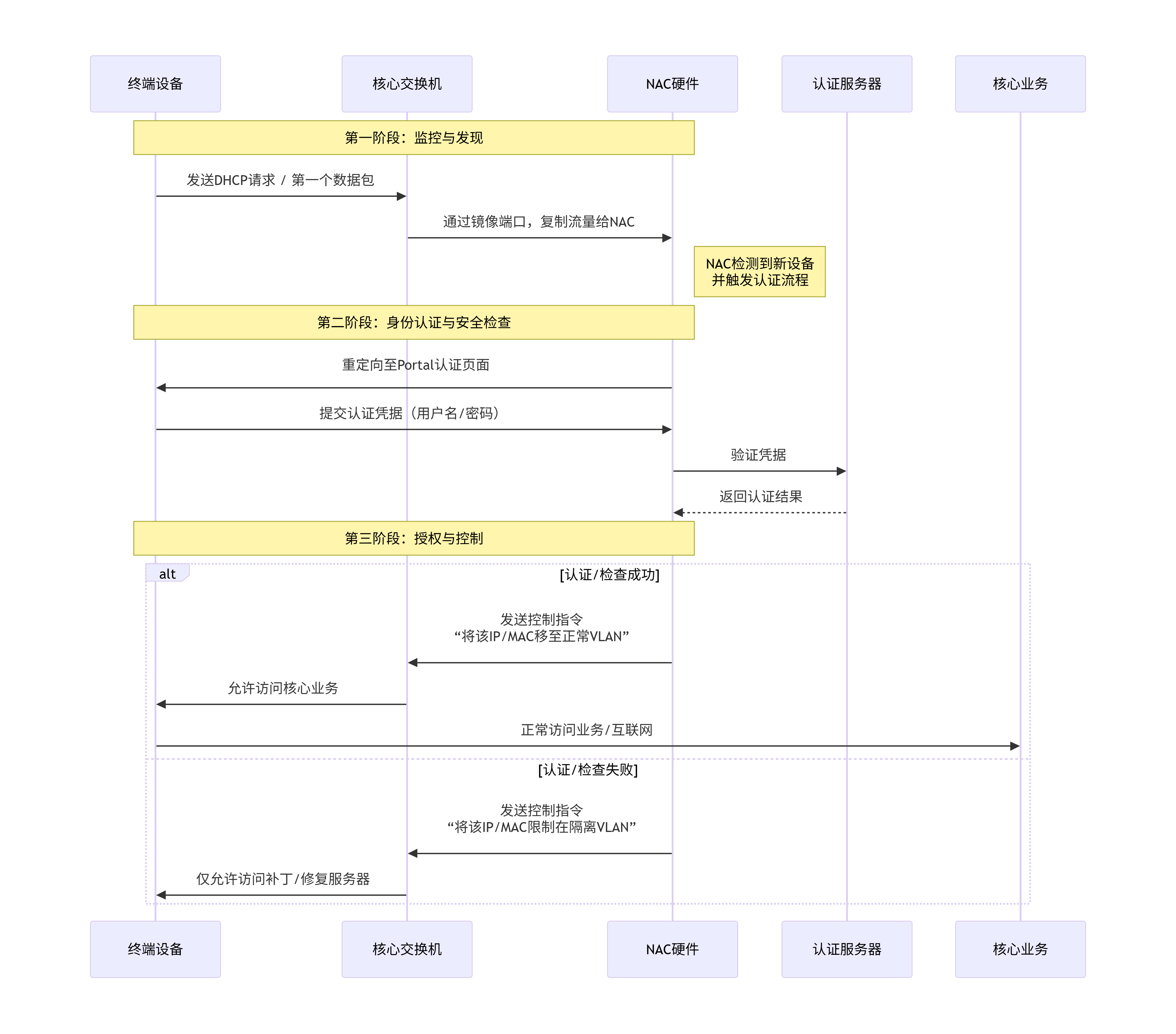 设备发现:NAC设备分析这些镜像流量。当一台新设备接入网络时,它通常会发送DHCP请求来获取IP地址,或发出第一个ARP请求、TCP