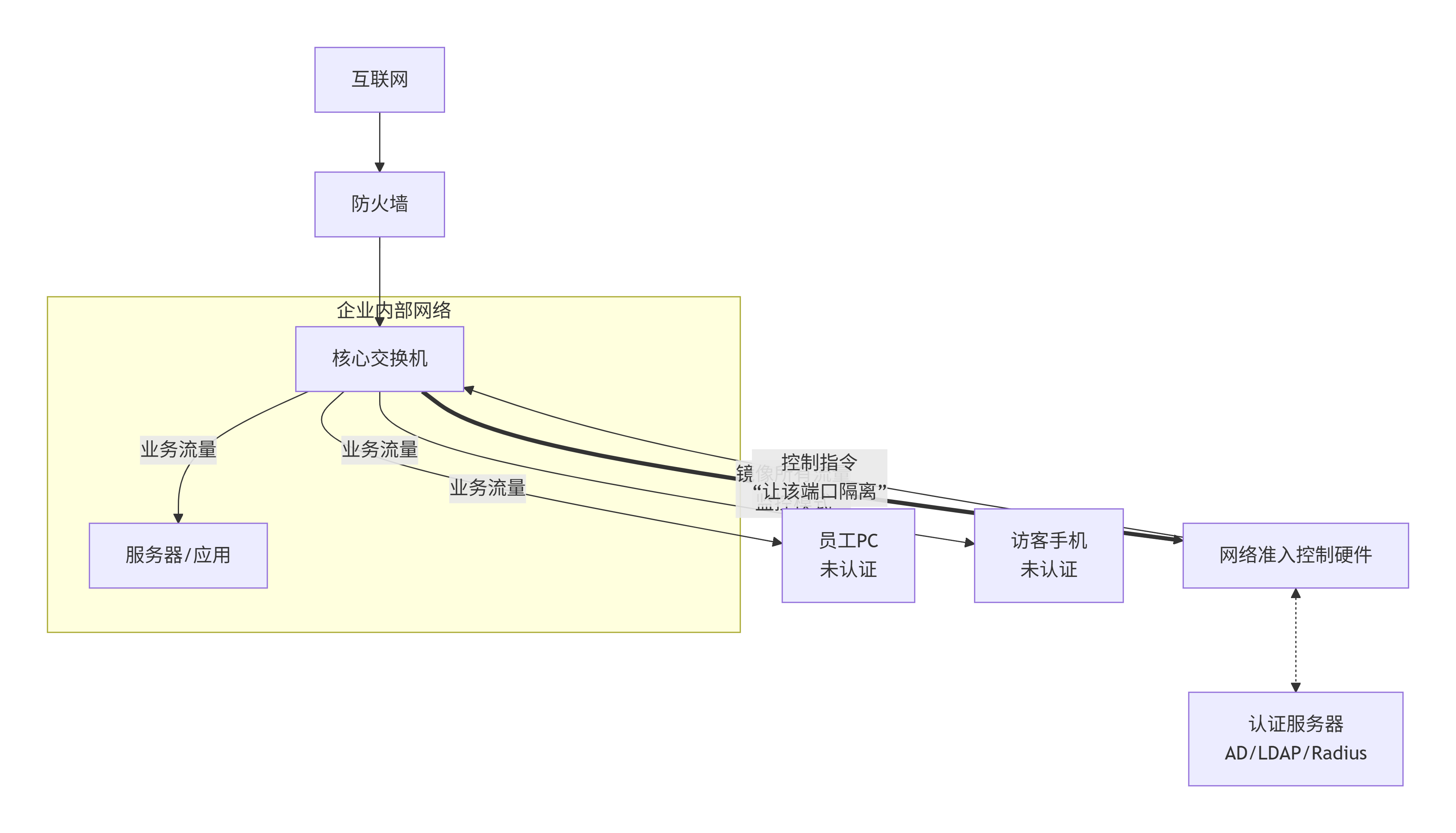 网络权限切换:核心交换机收到指令后,立即改变该设备的网络属性(变更VLAN、应用ACL),实现权限控制。